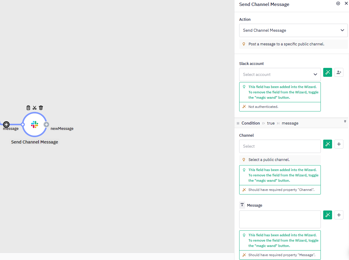 Our integration template is nearly complete. The next step is to setup the Slack - Send Channel Message component. This component includes three configuration fields: Slack account, Slack channel, and Message. These fields should not be hardcoded by the template creator. Instead, they are intended to be customizable by the end-user. This means the end-user will authenticate with their own Slack account, choose their desired Slack channel, and tailor the message to be sent.