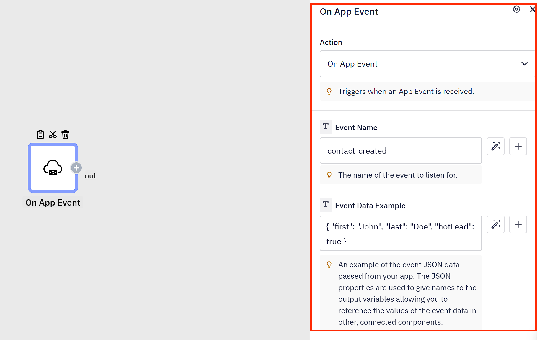 Configure the OnAppEvent trigger by setting the Event name to contact-created.Use { "first": "John", "last": "Doe", "hotLead": true } as the Event Data Example. This data sample will enable us to reference the specific data fields later in the integration workflow.