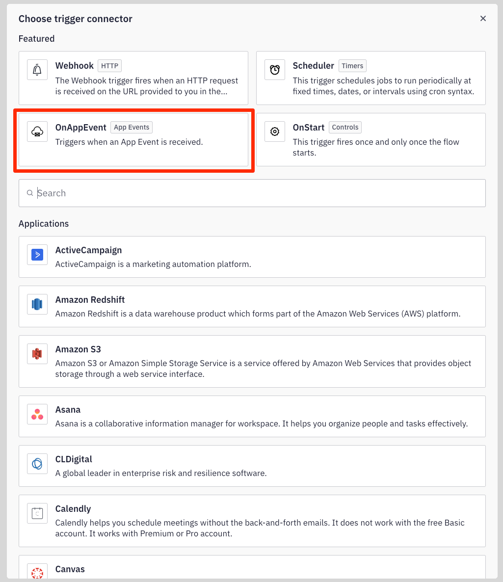 On the Integrations page, click the "Create Integration" button located in the top right corner. Then, select the OnAppEvent trigger from the Trigger selector. Utilizing App Events represents the simplest method for sending data to Appmixer.