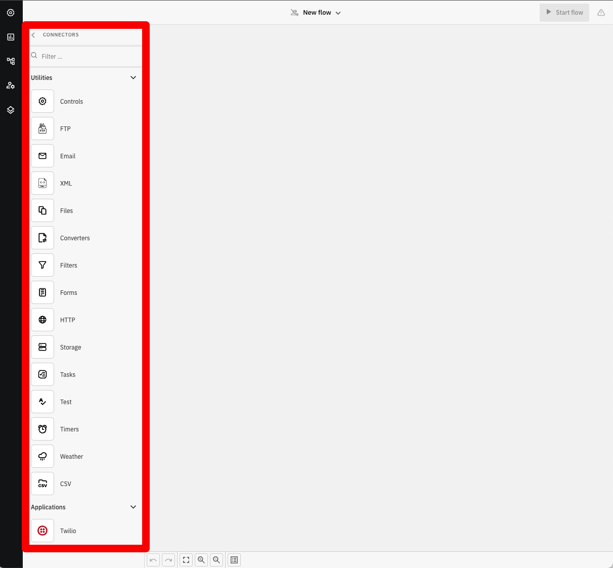 Once you save those two rules and create a flow on behalf of the user in the Appmixer studio, you should see the utility and twilio modules displayed: