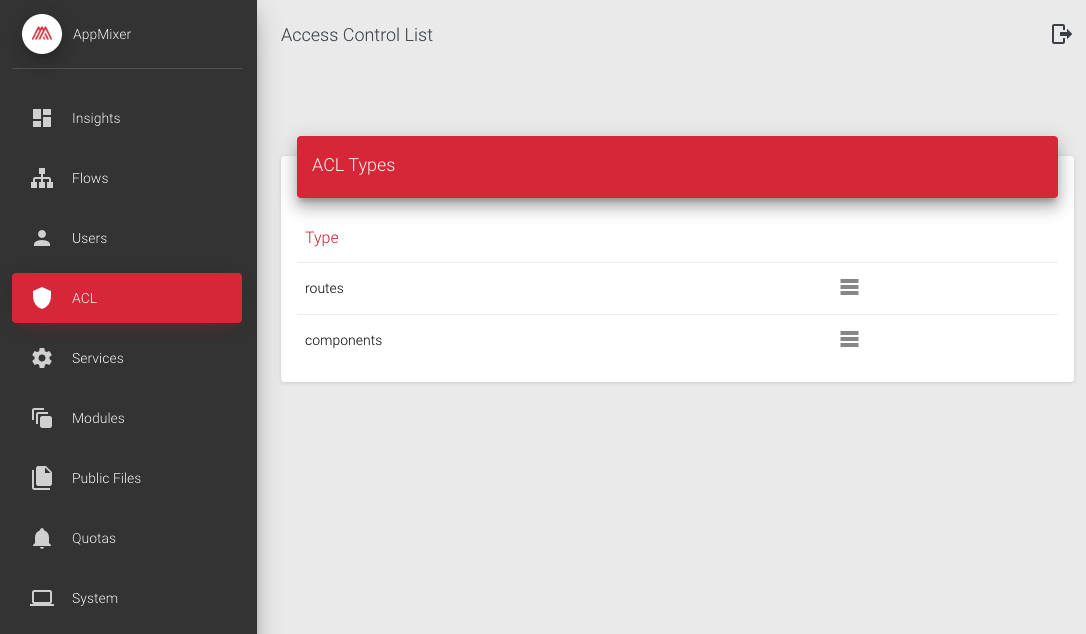 ACL rules in Appmixer are divided into two categories: routes and components. You can see the two categories when you visit the ACL page of your Appmixer Backoffice interface: