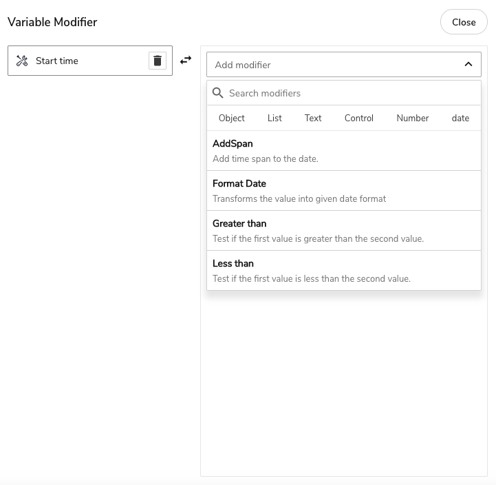 Appmixer is shipped with predefined set of modifiers which allows you to transform the variables in your flow in many different ways. The modifiers are organised in categories. Every modifier belongs to one or more categories.