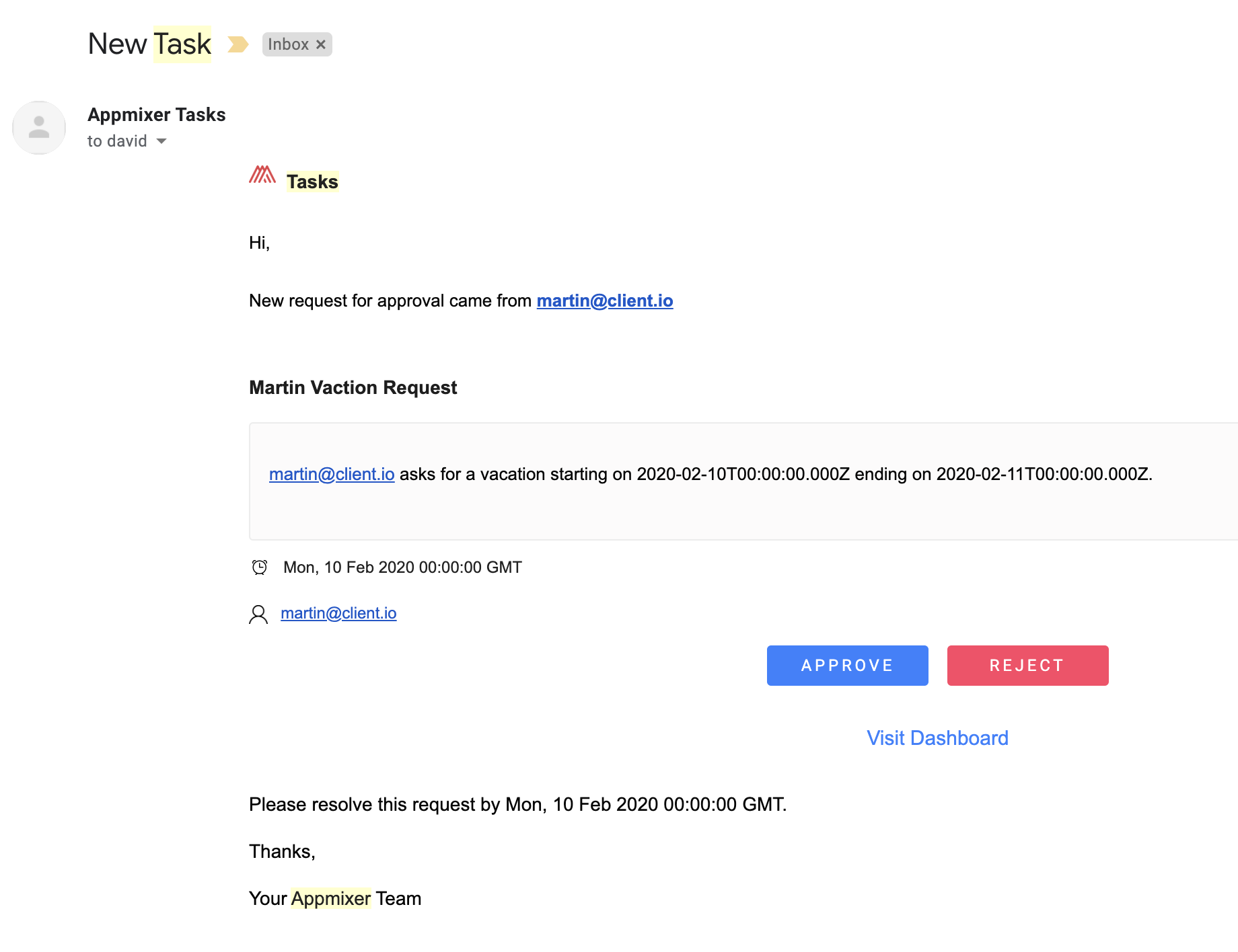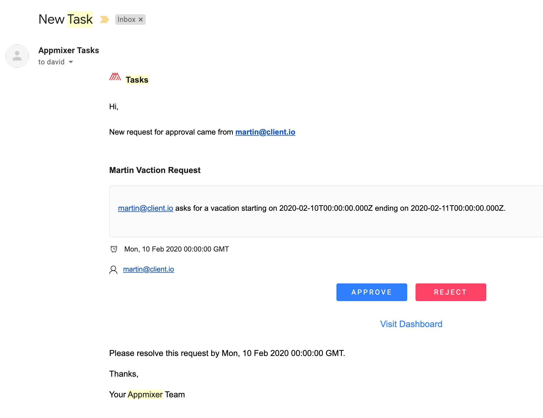 When an employee adds a new event in Google Calendar requesting a vacation, the person that's configured as an "approver" receives an email from the “RequestApprovalEmail” component that looks like this: