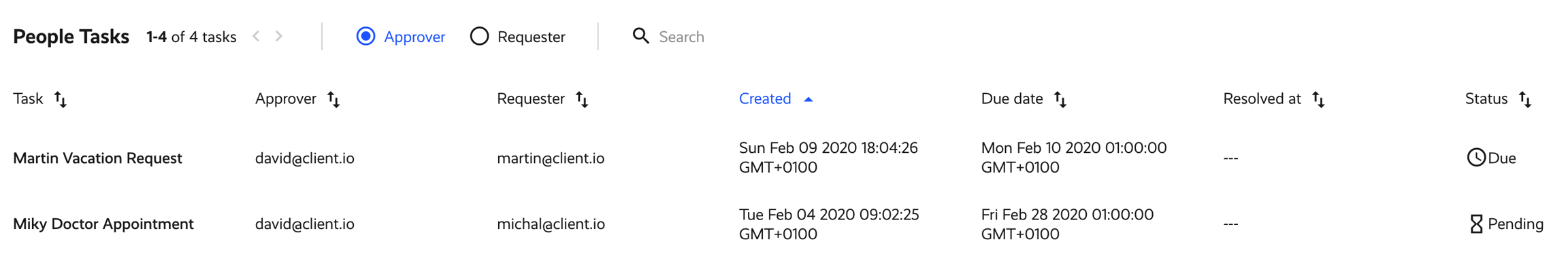 The flow for this particular request is blocked until the approver either approves or rejects this vacation request by clicking on the "Approve"/"Reject" links in their email. If the task is approved, our flow then continues to update the event in Google Calendar by adding a "CONFIRMED" text to the description of the event. If the request is rejected, the employee receives an email that their request was rejected. Both the approver and requester can visit their People Task dashboard that shows them an overview of all their approved/rejected/pending tasks: